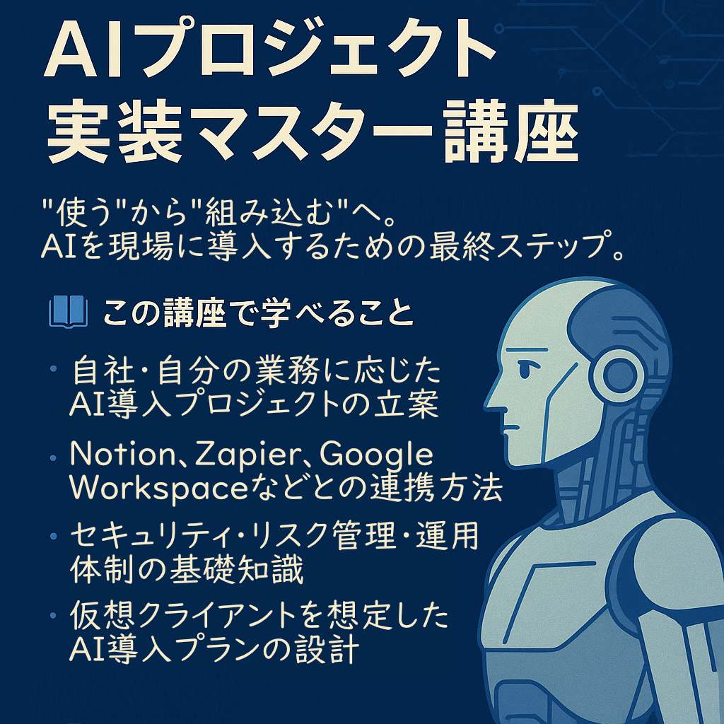 AIプロジェクト実装マスター講座では、実際の業務フローやビジネス課題に対して、ChatGPT APIやノーコード連携、ワークフロー自動化などを活用し、